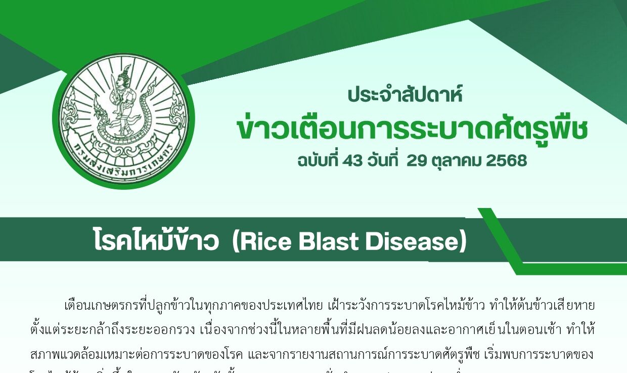 เตือนการระบาดกรมส่งเสริมการเกษตร เตือนการระบาดศัตรูพืช ฉบับที่ 43 วันที่ 29 ตุลาคม 2568 “โรคไหม้ข้าว”