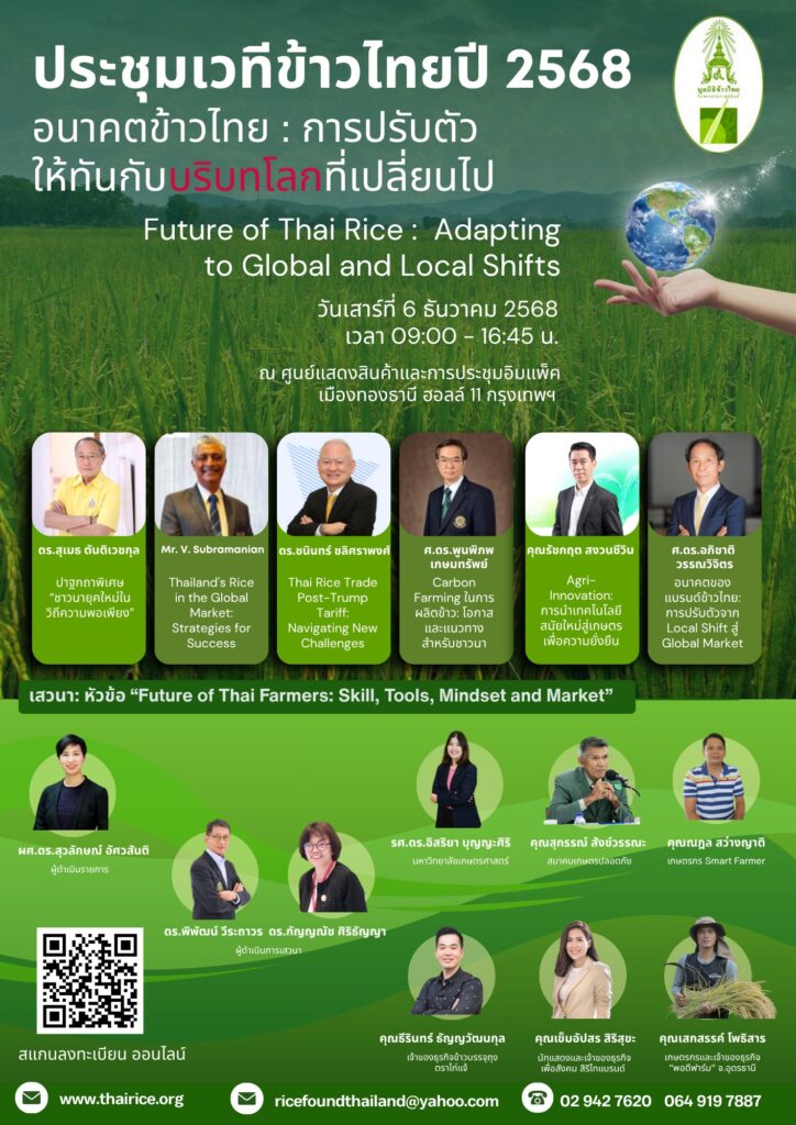 ประชุมเวทีข้าวไทย ปี 2568 อนาคตข้าวไทย : การปรับตัวให้ทันกับบริบทโลกที่เปลี่ยนไปBy admin_doae / 16 ตุลาคม 2025 จัดโดย : มูลนิธิข้าวไทย