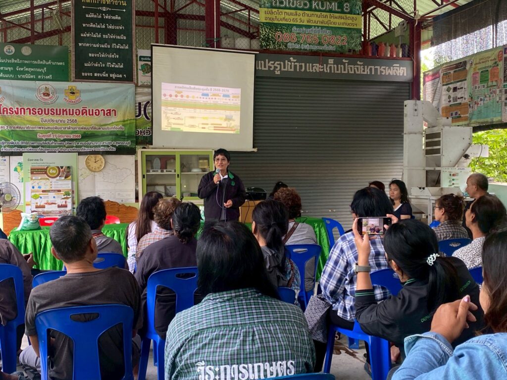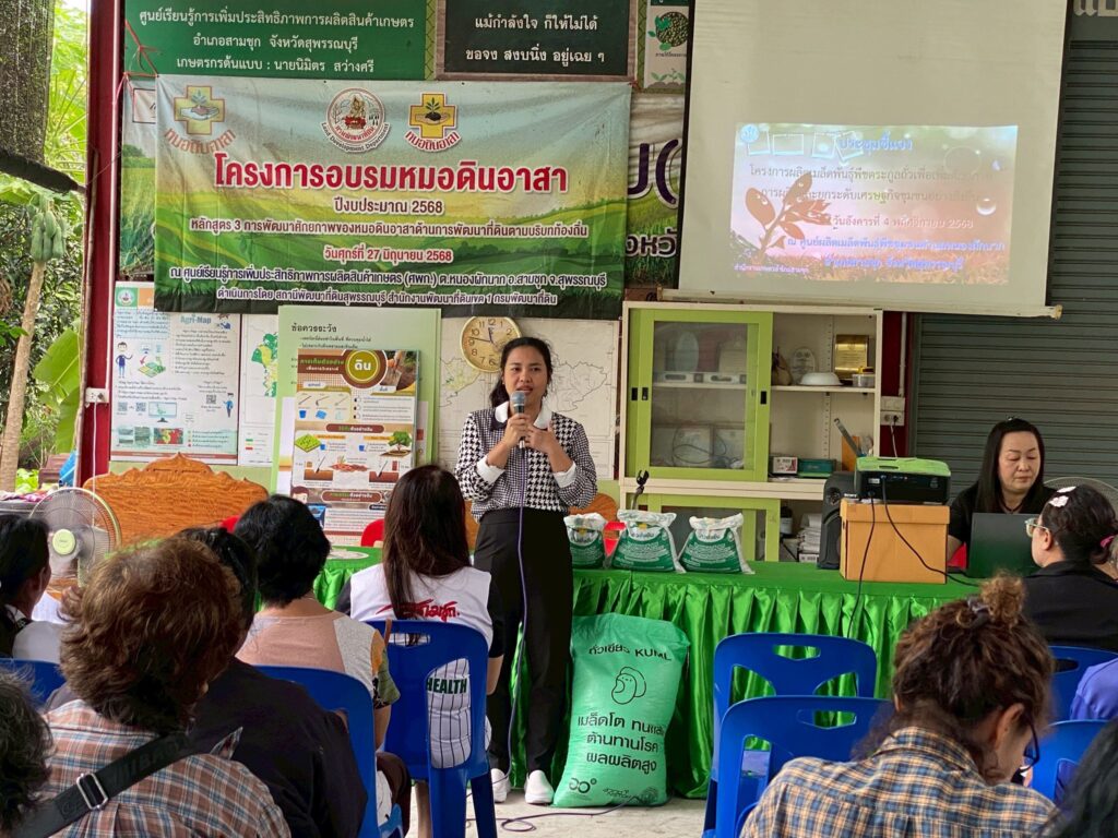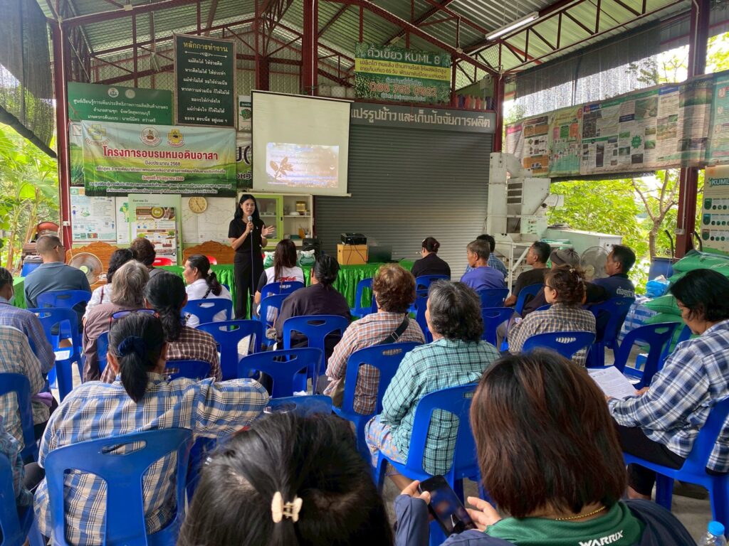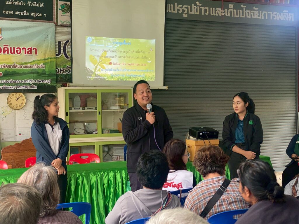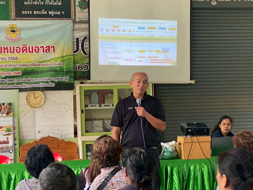 วันที่ 4 พฤศจิกายน 2568 นายภควรรณ ชัยรัตน์เมธี หัวหน้ากลุ่มส่งเสริมและพัฒนาการผลิต เจ้าหน้าที่กลุ่มส่งเสริมและพัฒนาการผลิต สำนักงานเกษตรจังหวัดสุพรรณบุรี ร่วมกับเกษตรอำเภอสามชุก และเจ้าหน้าที่สำนักงานเกษตรอำเภอสามชุก จังหวัดสุพรรณบุรี จัดอบรมชี้แจงโครงการผลิตเมล็ดพันธุ์พืชตระกูลถั่วเพื่อเพิ่มศักยภาพการผลิตและยกระดับเศรษฐกิจชุมชนอย่างยั่งยืน