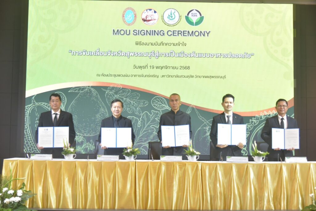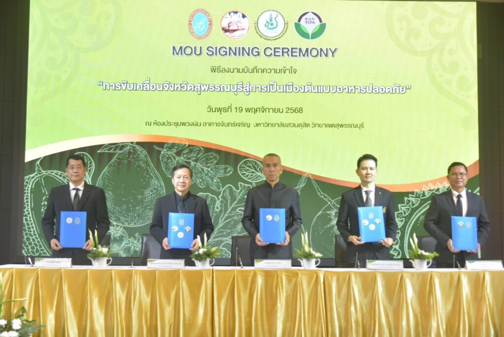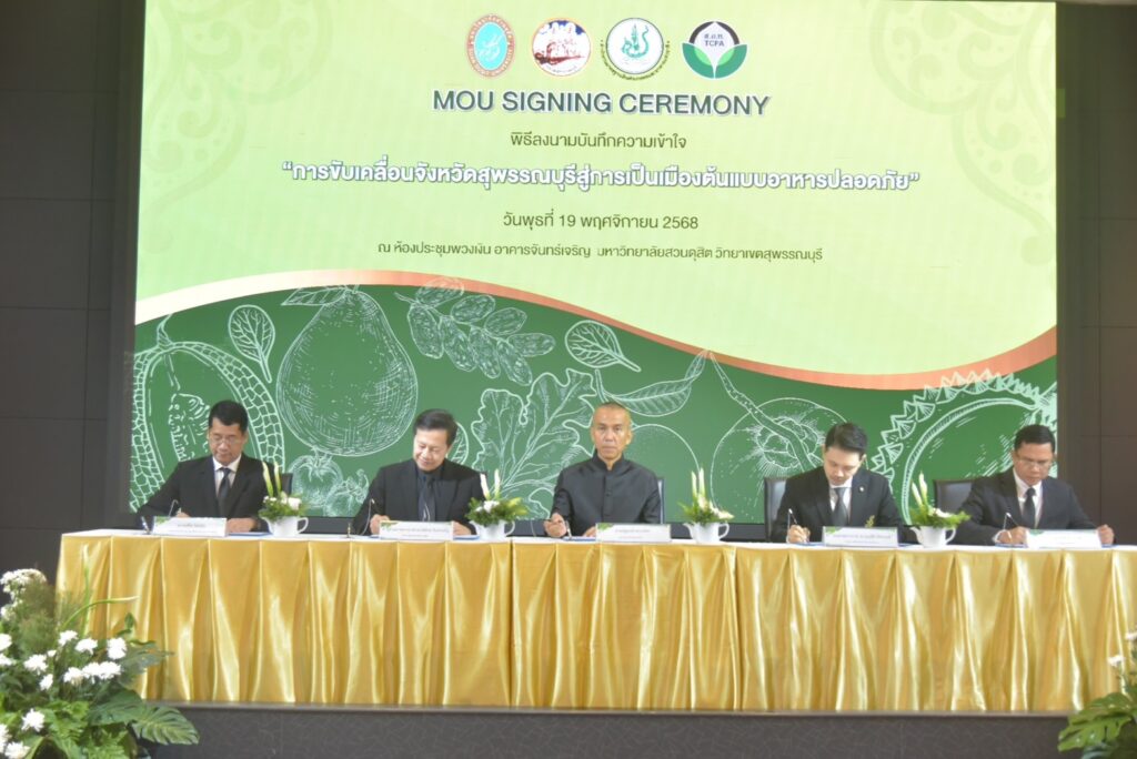 วันที่ 19 พฤศจิกายน 2568 นายวสันต์ จี้ปูคำ เกษตรจังหวัดสุพรรณบุรี เข้าร่วมพิธีลงนามบันทึกความเข้าใจ “การขับเคลื่อนจังหวัดสุพรรณบุรีสู่การเป็นเมืองต้นแบบอาหารปลอดภัย ณ ห้องประชุมพวงเงิน อาคารจันทร์เจริญ มหาวิทยาลัยสวนดุสิต วิทยาเขตสุพรรณบุรี โดยในงานมีการลงนามบันทึกความเข้าใจ ระหว่าง จังหวัดสุพรรณบุรี มหาวิทยาลัยสวนดุสิต มกอช. และสมาคมอารักขาพืชไทย ซึ่งกิจกรรมในวันนี้ถือเป็นอีกก้าวสำคัญของการพัฒนาเกษตรและอาหารในจังหวัดสุพรรณบุรีให้มีคุณภาพปลอดภัยและได้มาตรฐานสากล เพื่อให้สินค้าเกษตรและอาหารมีคุณภาพ ปลอดภัยต่อผู้บริโภค และสามารถแข่งขันได้ในตลาด ภายใต้ยุทธศาสตร์ “หนึ่งมาตรฐาน หนึ่งความเชื่อมั่น สู่ความยั่งยืน” ซึ่งเรามุ่งมั่นให้มาตรฐาน ไม่ใช่เพียง “ข้อกำหนดทางเทคนิค” แต่เป็น “เครื่องมือสร้างความเชื่อมั่น” และ “สร้างมูลค่าเพิ่ม” ให้แก่ เกษตรกรและผู้ประกอบการในทุกระดับ โดยสุพรรณบุรีเป็นจังหวัดที่มีศักยภาพสูงในด้านการผลิตสินค้าเกษตรและอาหาร ไม่ว่าจะเป็นข้าว พืช ผัก ผลไม้ ปศุสัตว์ ประมง และผลิตภัณฑ์แปรรูป ที่มีชื่อเสียงและได้รับความนิยมในวงกว้าง การขับเคลื่อนจังหวัดสุพรรณบุรีสู่การเป็น “เมืองต้นแบบอาหารปลอดภัย”