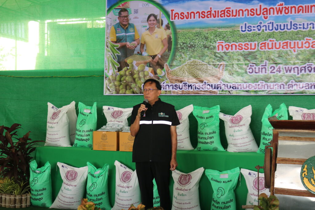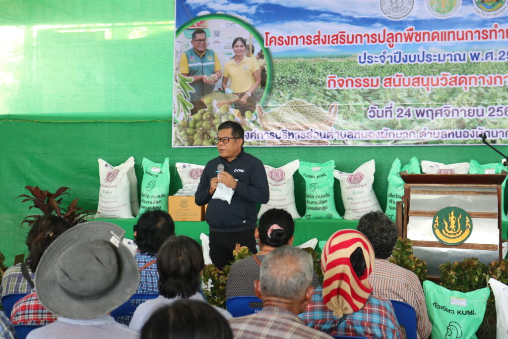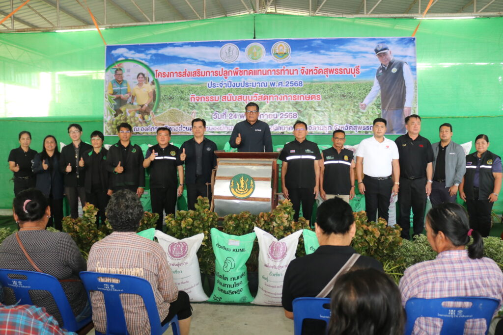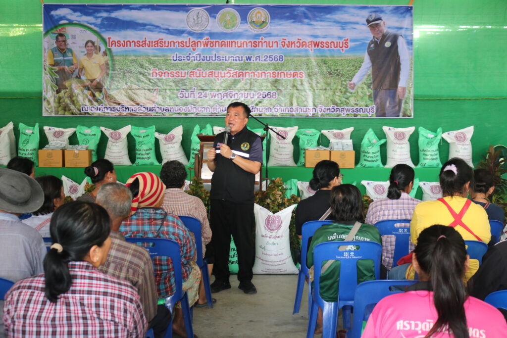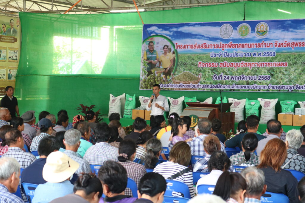 วันที่ 24 พฤศจิกายน 2568 เวลา 09.30 น. นายวสันต์ จี้ปูคำ เกษตรจังหวัดสุพรรณบุรี พร้อมด้วยเจ้าหน้าที่สำนักงานเกษตรจังหวัดสุพรรณบุรี เจ้าหน้าที่สำนักงานเกษตรอำเภอ ให้การต้อนรับนายรพีทัศน์ อุ่นจิตตพันธุ์ รองอธิบดีกรมส่งเสริมการเกษตร ในการมาเยี่ยมเยียนและติดตามการดำเนินงานโครงการส่งเสริมการปลูกพืช (ถั่วเขียว) ทดแทนการทำนา โดยมีกรมวิชาการเกษตรบรรยายให้ความรู้ เรื่องพันธุ์ถั่วเขียว การป้องกันกำจัดศัตรูพืช การเก็บเกี่ยว และการจัดการหลังการเก็บเกี่ยว ในการนี้นายรพีทัศน์ อุ่นจิตตพันธุ์ รองอธิบดีกรมส่งเสริมการเกษตร ได้พบปะและร่วมมอบเมล็ดพันธ์ุถั่วเขียวให้กับเกษตรกรที่เข้าร่วมโครงการ จำนวน 350 ราย ณ องค์การบริหารส่วนตำบลหนองผักนาก ตำบลหนองผักนาก อำเภอสามชุก จังหวัดสุพรรณบุรี