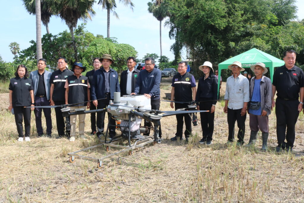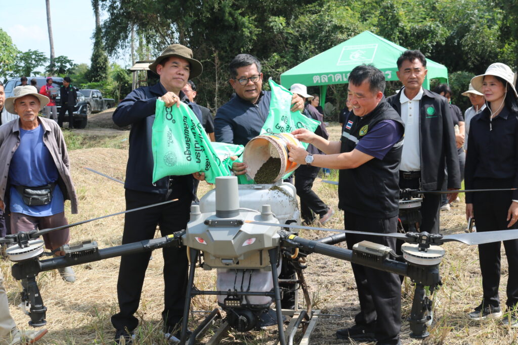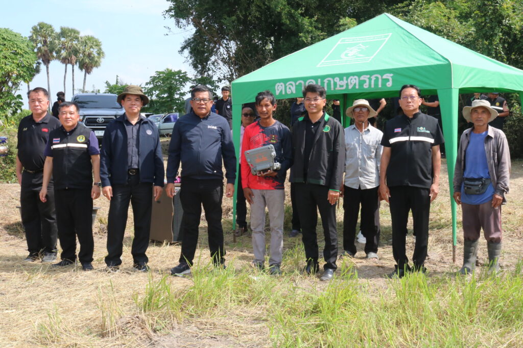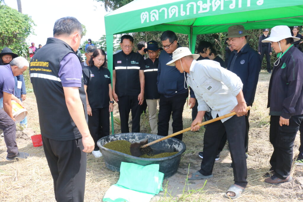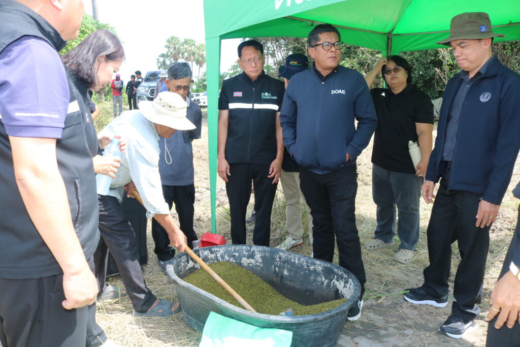หลังจากนั้น ได้ลงพื้นที่แปลงตัวอย่าง การปลูกถั่วเขียวโดยใช้เทคโนโลยีสมัยใหม่ โดรนพ่นเมล็ดพันธุ์ ในการใช้หว่านเมล็ดพันธุ์ถั่วเขียว ในพื้นที่ตำบลหนองผักนาก อำเภอสามชุก จังหวัดสุพรรณบุรี