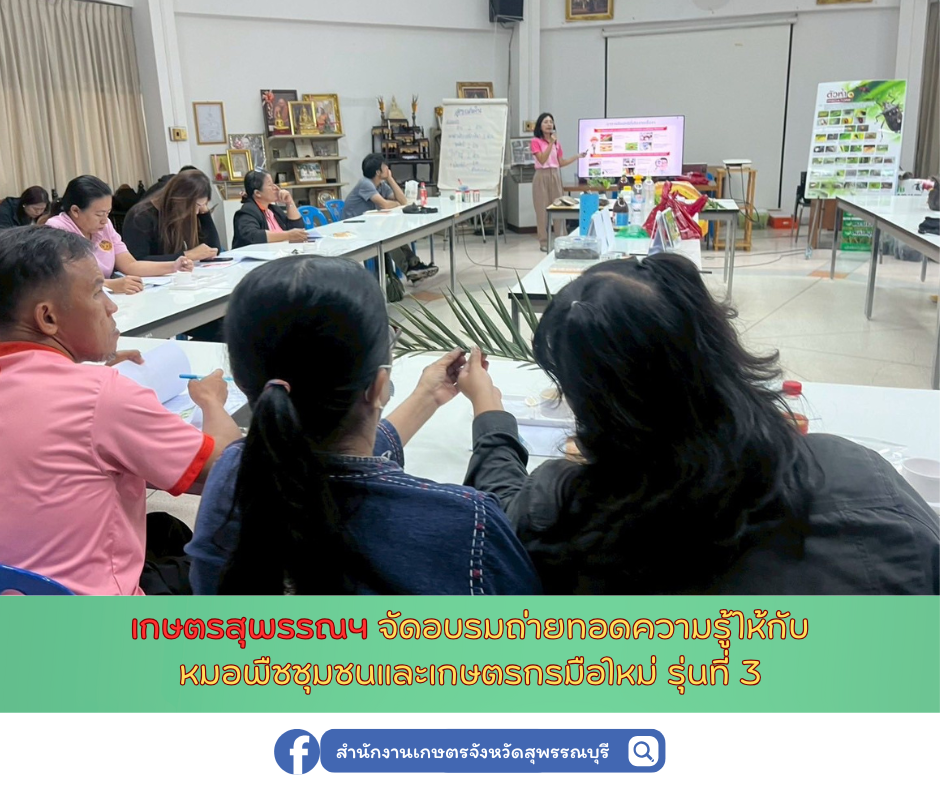 ข่าวประชาสัมพันธ์สำนักงานเกษตรจังหวัดสุพรรณบุรี จัดอบรมถ่ายทอดความรู้ให้กับหมอพืชชุมชนและเกษตรกรมือใหม่ รุ่นที่ 3 วันที่ 24 กรกฎาคม 25