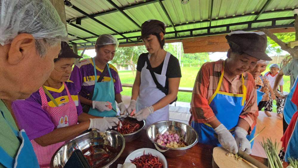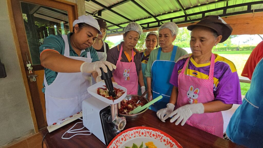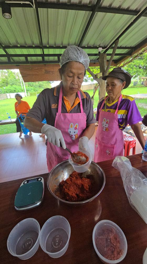 นางทัศนีย์ เชาว์วิเศษ นักวิชาการส่งเสริมการเกษตรชำนาญการพิเศษ และนางสาววรางคณา กาฬภักดี นักวิชาการส่งเสริมการเกษตรปฏิบัติการ ดำเนินการส่งเสริมและถ่ายทอดความรู้การทำพริกแกงเผ็ด ให้กับกลุ่มแม่บ้านเกษตรกรแปรรูปสมุนไพรบ้านพุหวาย ภายใต้โครงการฟื้นฟูนิเวศต้นน้ำและพัฒนาอาชีพในพื้นที่โครงการอ่างเก็บน้ำห้วยยาง 1 ตำบลนิคมกระเสียว