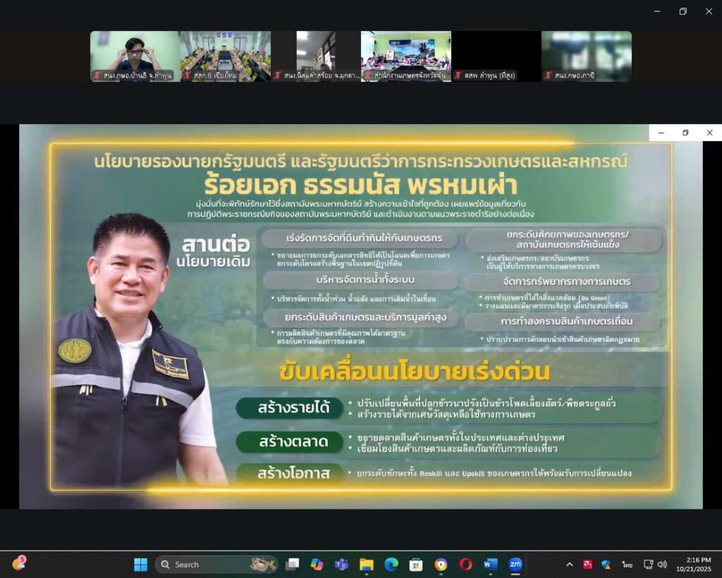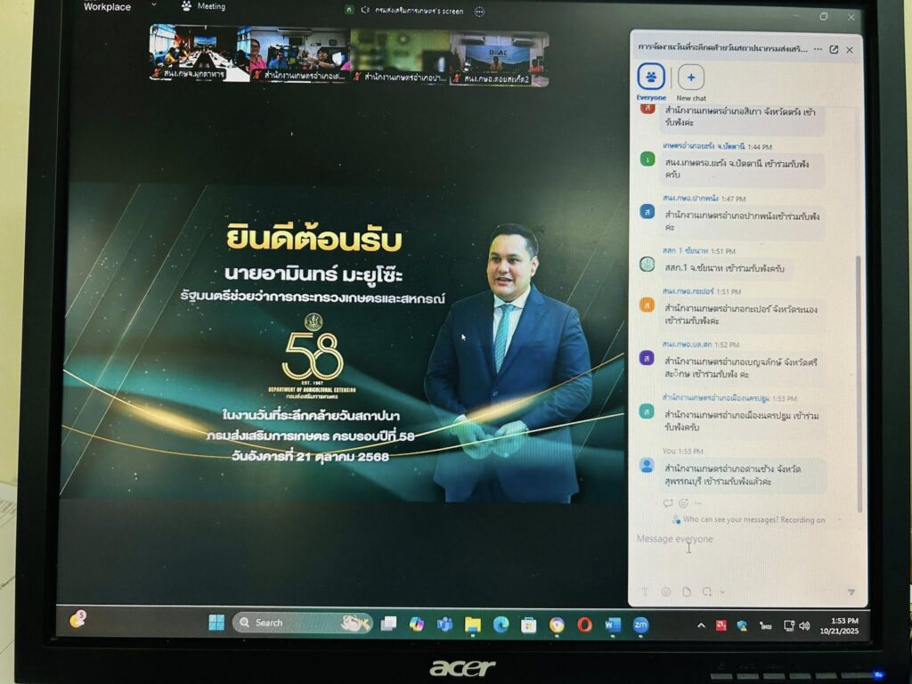 เข้าร่วมรับฟังการมอบนโยบายให้แก่เจ้าหน้าที่กรมส่งเสริมการเกษตร โดย นายอามินทร์ มะยูโซ๊ะ รัฐมนตรีช่วยว่าการกระทรวงเกษตรและสหกรณ์ เนื่องในงานวันที่ระลึกวันคล้ายวันสถาปนากรมส่งเสริมการเกษตร ครบรอบปีที่ 58 โดยผ่านระบบ Zoom Meeting