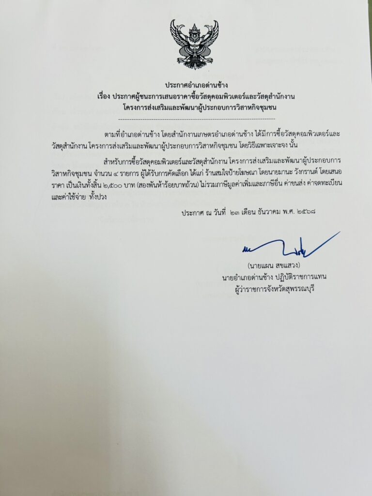 ประกาศผู้ชนะการเสนอราคาซื้อวัสดุคอมพิวเตอร์และวัสดุสำนักงาน โครงการส่งเสริมและพัฒนาผู้ประกอบการวิสาหกิจชุมชนBy danchang / 23 ธันวาคม 2025