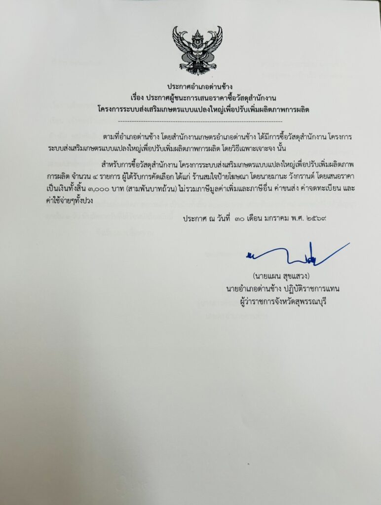 ประกาศผู้ชนะการเสนอราคาซื้อซื้อวัสดุสำนักงาน โครงการระบบส่งเสริมเกษตรแบบแปลงใหญ่เพื่อปรับเพิ่มผลิตภาพการผลิต (แปลงปีที่ 2)By danchang / 30 มกราคม 2026
