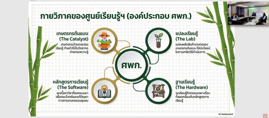 เข้าร่วมประชุมระบบทางไกล (Zoom Meeting) เพื่อชี้แจงแนวทางการคัดเลือก แต่งตั้ง คณะกรรมการศูนย์เรียนรู้การเพิ่มประสิทธิภาพการผลิตสินค้าเกษตร (ศพก.) ทุกระดับปี พ.ศ. 2569 โดยมีวัตถุประสงค์เพื่อชี้แจงสร้างความเข้าใจเกี่ยวกับการคัดเลือกและแต่งตั้งคณะกรรมการ ศพก.ระดับอำเภอ คณะกรรมการเครือข่าย ศพก. และที่ปรึกษาคณะกรรมการเครือข่าย ศพก.