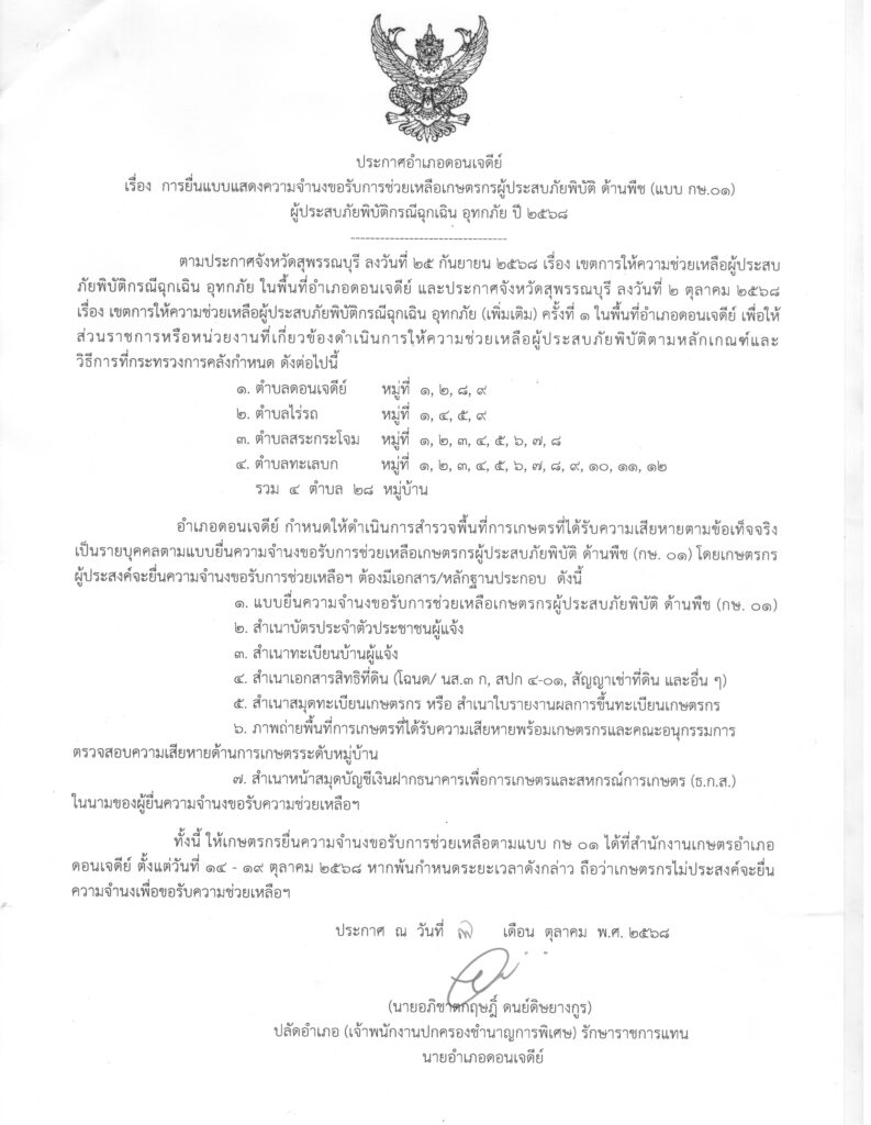 ประกาศอำเภอดอนเจดีย์ เรื่อง การยื่นแบบแสดงความจำนงขอรับการช่วยเหลือเกษตรกรผู้ประสบภัยพิบัติ ด้านพืช (แบบ กษ.01) ผู้ประสบภัยพิบัติกรณีฉุกเฉิน อุทกภัย ปี 2568By donchedi / 7 ตุลาคม 2025