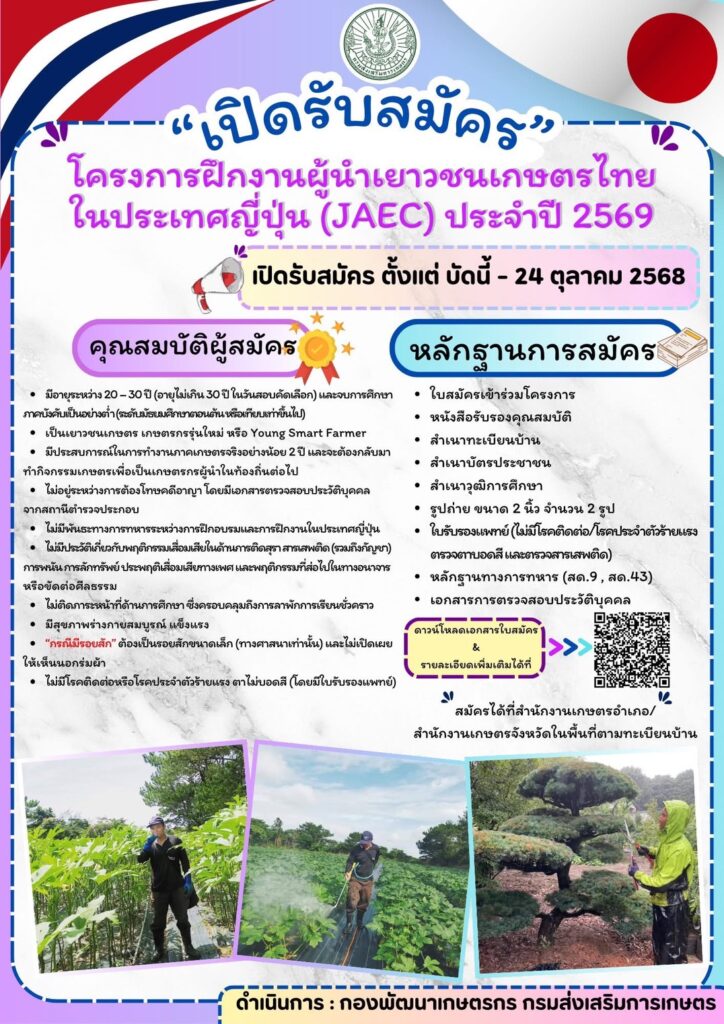 กรมส่งเสริมการเกษตร เปิดรับสมัคร “โครงการฝึกงานผู้นำเยาวชนเกษตรกรไทยในประเทศญี่ปุ่น (JAEC) ประจำปี 2569”