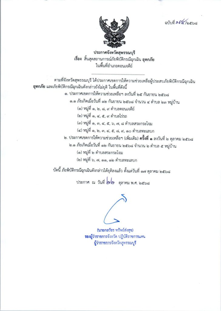 ประกาศจังหวัดสุพรรณบุรี เรื่อง สิ้นสุดสถานการณ์ภัยพิบัติกรณีฉุกเฉิน อุทกภัย ในพื้นที่อำเภอดอนเจดีย์By donchedi / 22 ตุลาคม 2025