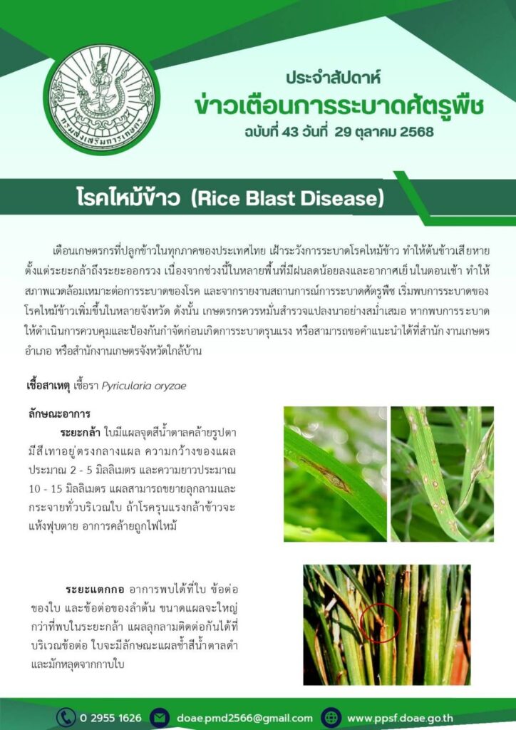เตือน📣📣📣 การระบาด “โรคไหม้ข้าว” #เตือนการระบาดศัตรูพืชปีที่12 #เตือนเฝ้าระวังศัตรูพืชBy donchedi / 4 พฤศจิกายน 2025