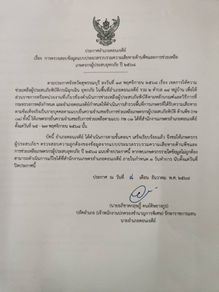 ประกาศอำเภอดอนเจดีย์ เรื่อง การตรวจสอบข้อมูลแบบประเมินรวบรวมความเสียหายด้านพืชและการช่วยเหลือเกษตรกรผู้ประสบอุทกภัย ปี 2568By donchedi / 8 ธันวาคม 2025