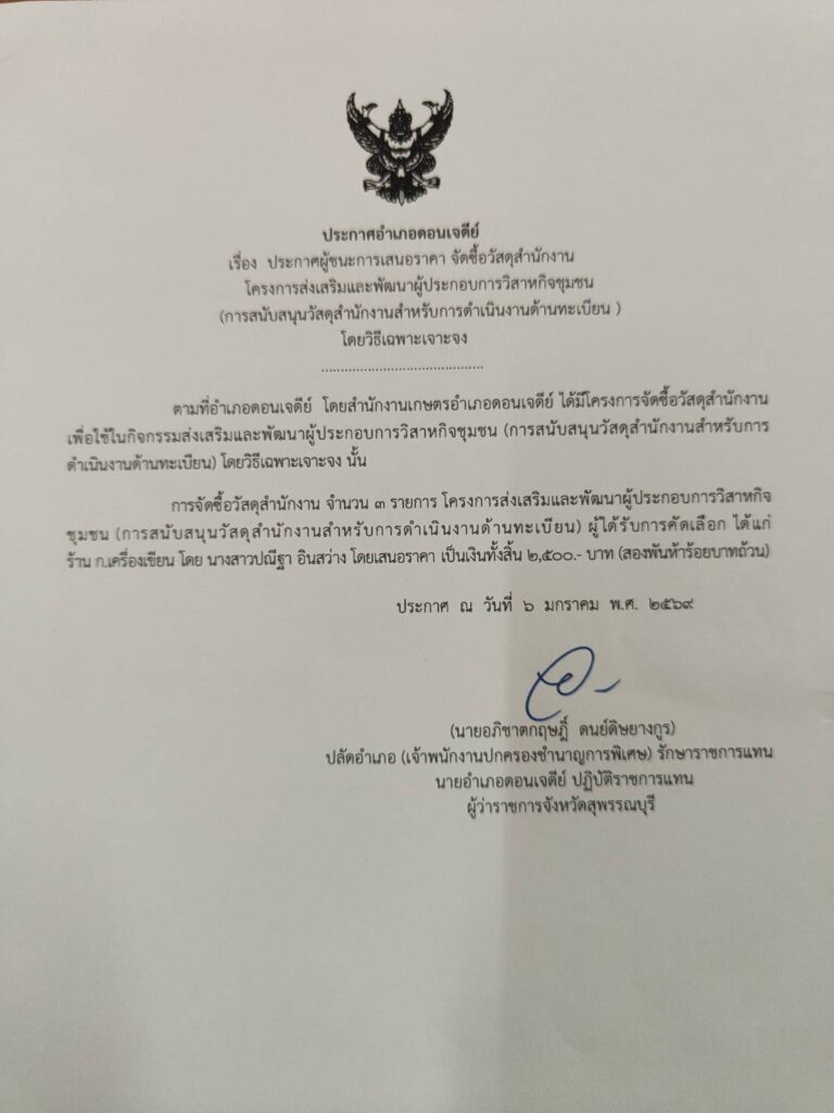 ประกาศอำเภอดอนเจดีย์ เรื่อง ประกาศผู้ชนะการเสนอราคา จัดซื้อวัสดุสำนักงาน โครงการส่งเสริมและพัฒนาผู้ประกอบการวิสาหกิจชุมชน (การสนับสนุนวัสดุสำนักงานสำหรับการดำเนินงานด้านทะเบียน) โดยวิธีเฉพาะเจาะจงBy donchedi / 6 มกราคม 2026