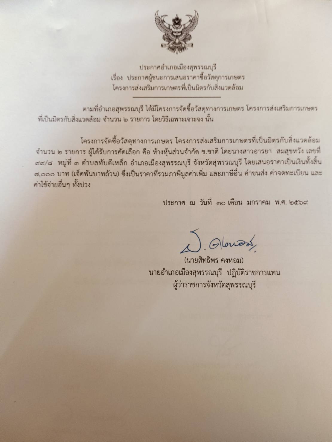 ข่าวจัดซื้อจัดจ้างประกาศผู้ชนะการเสนอราคาจัดซื้อวัสดุทางการเกษตรโครงการส่งเสริมการเกษตรที่เป็นมิตรกับสิ่งแวดล้อมโดยวิธีเฉพาะเจาะจง ลงวันที่ 29 มกราคม 2569