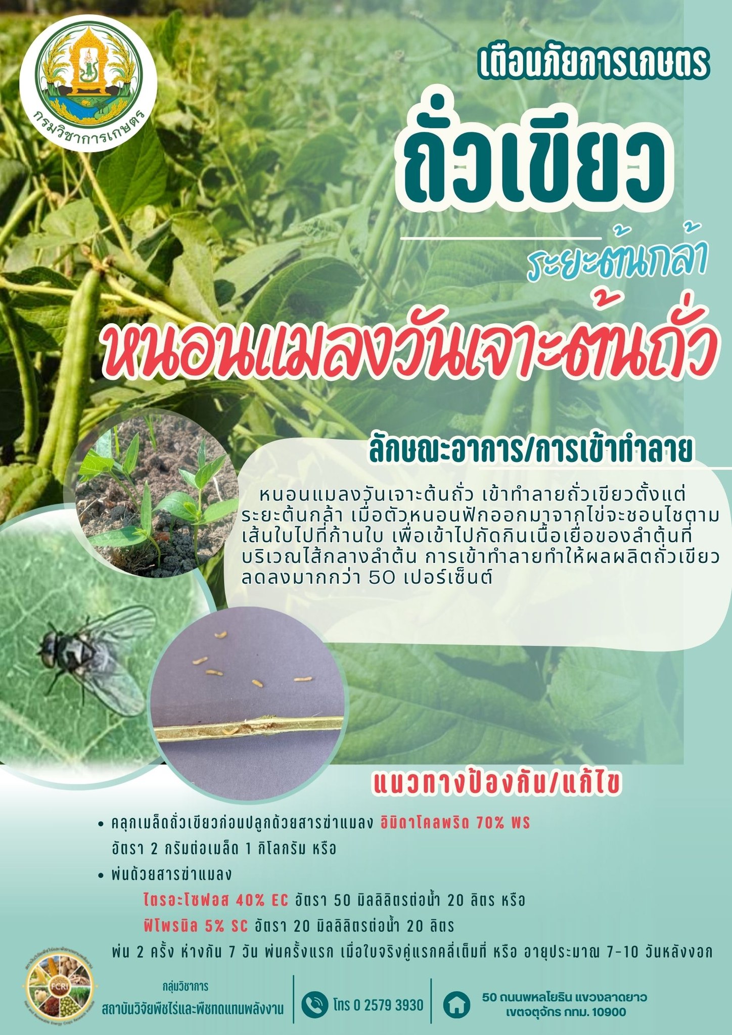 ข่าวประชาสัมพันธ์เตือนภัยการเกษตร เกษตรกรผู้ปลูกถั่วเขียวในระยะต้นกล้า ให้ระวังการเข้าทำลายของหนอนแมลงวันเจาะต้นถั่ว ควรหมั่นสำรวจแปลงปลูกหากเริ่มพบอาการหรือการเข้าทำลายให้รีบทำการป้องกันกำจัดตามคำแนะนำ