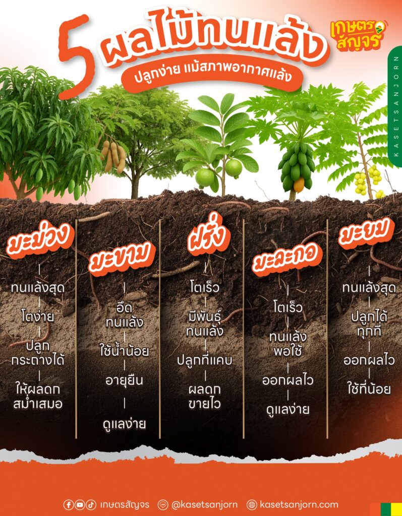 สำหรับใครที่รักการปลูกผลไม้แต่มีพื้นที่จำกัดหรือกำลังเจอปัญหาน้ำไม่เพียงพอในช่วงแล้ง ไม่ต้องกังวลไป เพราะการปลูกผลไม้ทนแล้งไม่ได้ยากอย่างที่คิด! วันนี้เกษตรสัญจรขอพาทุกคนมาทำความรู้จักกับ 5 ผลไม้ทนแล้ง ที่ปลูกง่าย ดูแลง่าย เหมาะกับสวนขนาดเล็กและยังให้ผลผลิตคุ้มค่า ไม่ต้องพึ่งน้ำมาก แต่ยังคงโตแข็งแรงและออกผลดี พร้อมเทคนิคการปลูกและดูแล ให้สร้างสวนผลไม้ทนแล้งที่บ้านได้อย่างมั่นใจ