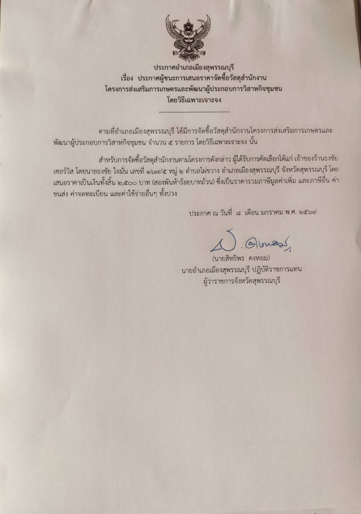 ประกาศผู้ชนะการเสนอราคาจัดซื้อวัสดุสำนักงาน โครงการส่งเสริมการเกาตาและพัฒนาผุ้ประกอบการวิสาหกิจชุมชน โดยวิะีเฉพาะเจาะจง ลงวันที่ 8 มกราคม 2569By สำนักงานเกษตรอำเภอเมืองสุพรรณบุรี / 14 มกราคม 2026