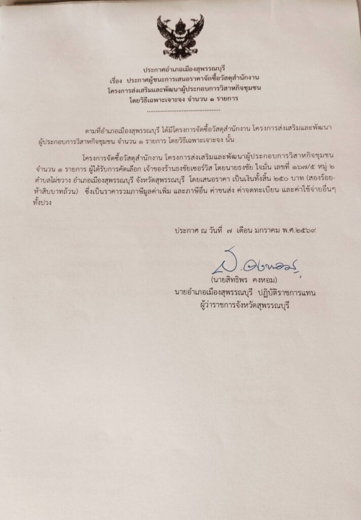 ประกาศผู้ชนะการเสนอราคาจัดซ้อวัสดุสำนักงาน โครงการส่งเสริมแบะพัฒนาผู้ประกอบการวิสาหกิจชุมชน โดยวิธีเฉพาะเจาะจง ลงวันที่ 7 มกราคม 2569By สำนักงานเกษตรอำเภอเมืองสุพรรณบุรี / 14 มกราคม 2026