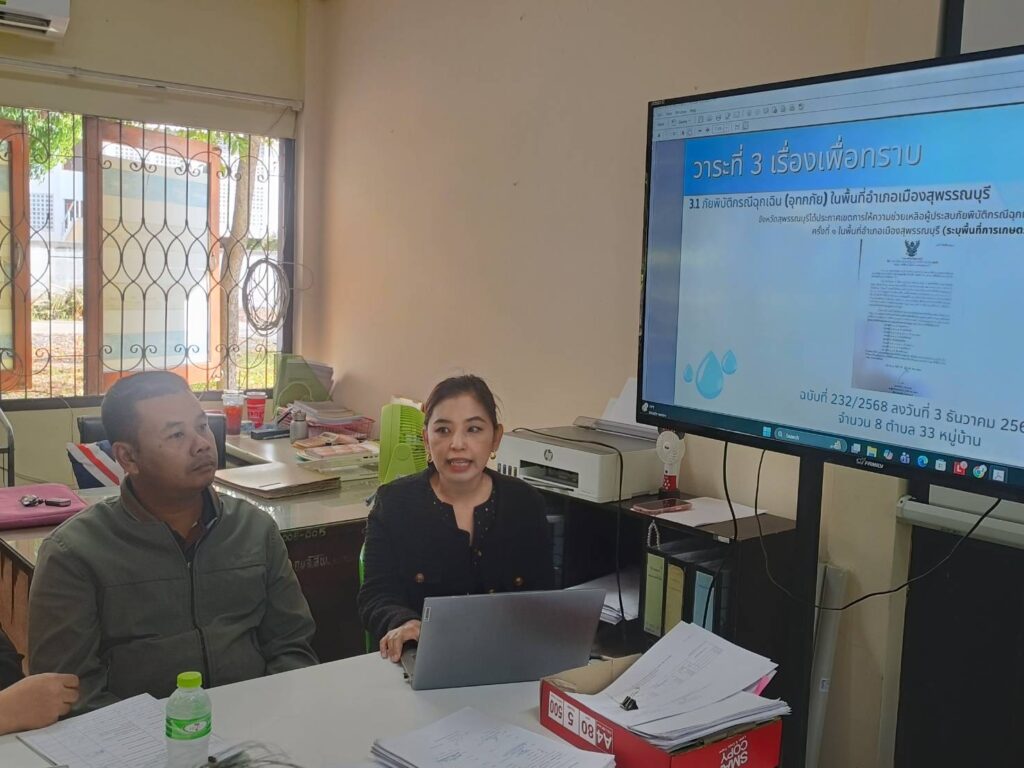 วันพุธที่ 7 มกราคม 2569 นางอรอนงค์ สว่างศรี เกษตรอำเภอเมืองสุพรรณบุรี พร้อมด้วยนางสาวอลิสา สะหะหิรัญ นักวิชาการส่งเสริมการเกษตรชำนาญการพิเศษ ให้การต้อนรับคณะทำงานกลั่นกรองรายละเอียดการให้ความช่วยเหลือผู้ประสบภัยพิบัติ และนำเสนอข้อมูลของเกษตรกรผู้ประสบภัยพิบัติ ด้านพืช จำนวน 10 ราย วงเงินขอรับการช่วยเหลือ 58,809 บาท ที่ผ่านมติเห็นชอบจากคณะกรรมการให้ความช่วยเหลือผู้ประสบภัยพิบัติอำเภอเมืองสุพรรณบุรีแล้ว เมื่อวันที่ 26 ธันวาคม 2568 ณ หัองประชุมสำนักงานเกษตรอำเภอเมืองสุพรรณบุรี
