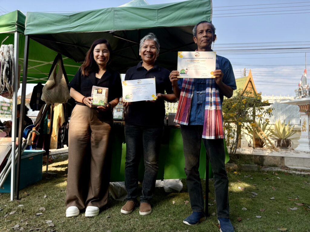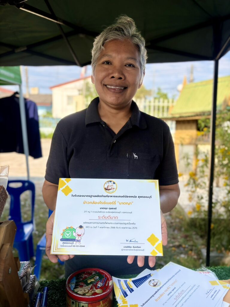 วันอังคารที่ 3 กุมภาพันธ์ 2569 นางสาวอลิสา สะหะหิรัญ นักวิชาการส่งเสริมการเกษตรชำนาญการพิเศษ รับผิดชอบงานส่งเสริมการเกษตรประจำตำบลดอนโพธิ์ทอง และตำบลดอนมะสังข์ เยี่ยมเยียน นางสาวนาตญา กุลสงฆ์ Young Smart Farmer รุ่นที่ 3 ณ ตลาดเกษตรกรในสวน @สุพรรณบุรี โดยนางสาวนาตญา กุลสงฆ์ มีกิจกรรมการเกษตรคือ การปลูกข้าวไรซ์เบอร์รี่ ข้าว กข 43 และข้าวทับทิมชุมแพ จำนวน 25 ไร่ เพื่อผลิตเป็นข้าวไรซ์เบอร์รึ่ ข้าว กข 43 และข้าวทับทิมชุมแพ บรรจุถุงจัดจำหน่ายที่ตลาดเกษตรกรในสวน@สุพรรณบุรี ซึ่งจัดขึ้นทุกๆวันอังคาร บริเวณด้านหน้าสำนักงานเกษตรจังหวัดสุพรรณบุรี โดยผลิตภัณฑ์ข้าวบรรจุถุงในแบรนด์ “นาตญา” ได้รับใบรับรองมาตราฐานผลิตภัณฑ์อาหารแบรนด์น้องเหน่อ สุพรรณบุรี ระดับ ดีมาก