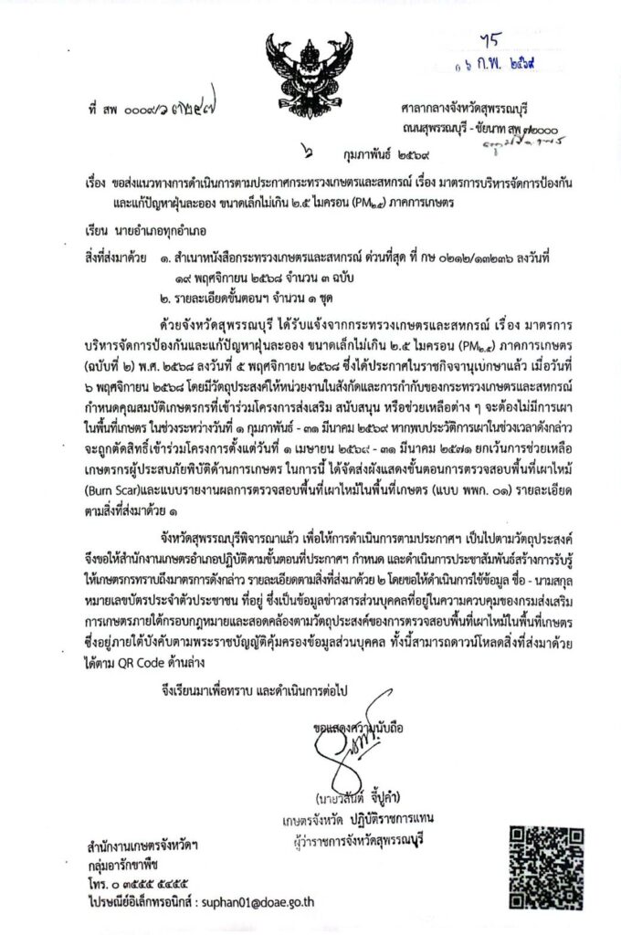 สำนักงานเกษตรอำเภอเมืองสุพรรณบุรี ขอส่งแนวทางการดำเนินการตามประกาศกระทรวงเกษตรและสหกรณ์ เรื่อง มาตรการบริหารจัดการป้องกัน และแก้ปัญหาฝุ่นละออง ขนาดเล็กไม่เกิน2.5ไมครอน (PM2.5) ภาคการเกษตร