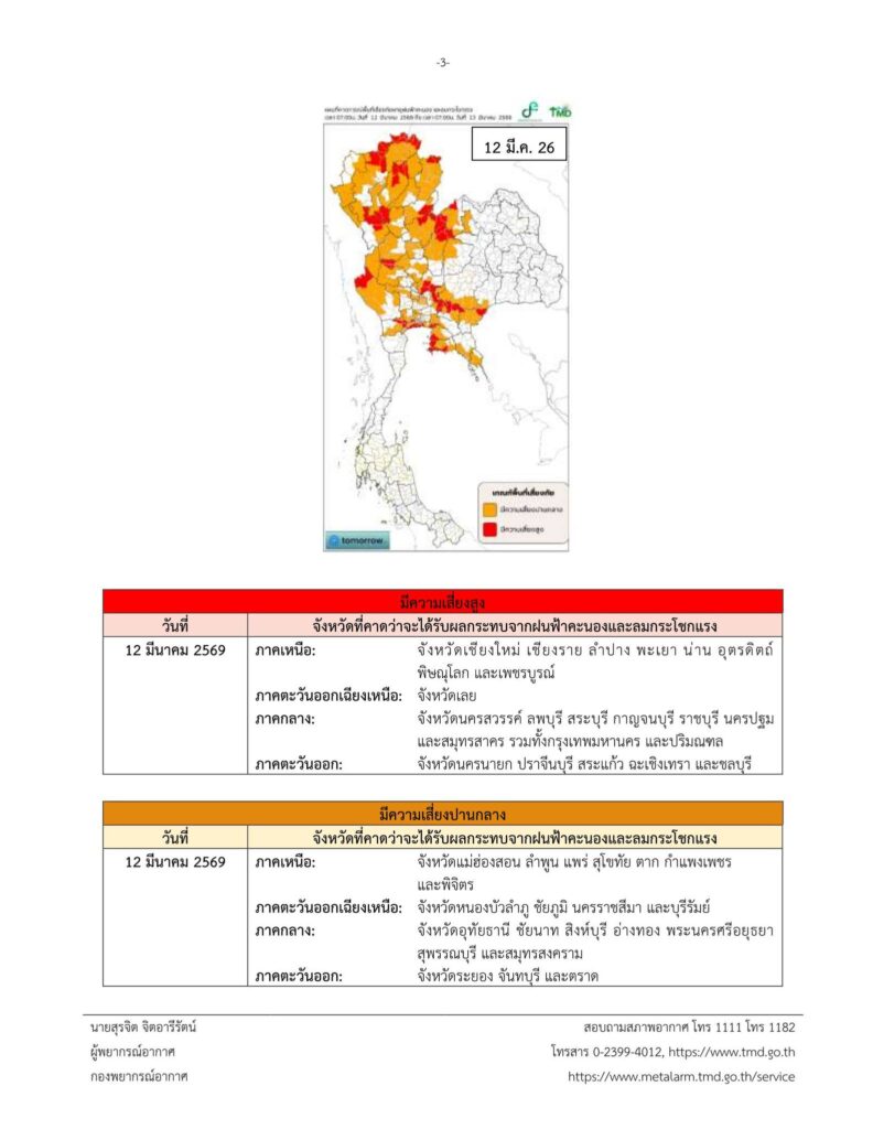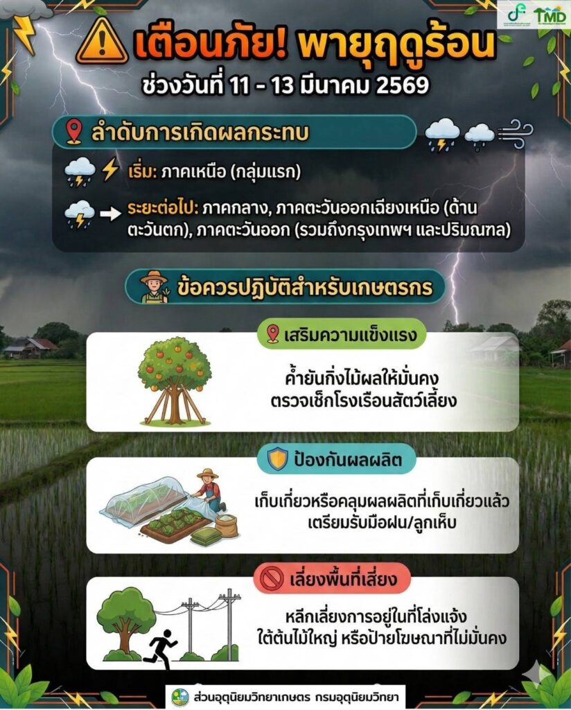 ประกาศกรมอุตุนิยมวิทยาBy สำนักงานเกษตรอำเภอเมืองสุพรรณบุรี / 11 มีนาคม 2026 เตือนภัย พายุฤดูร้อน Cr. ส่วนอุตุนิยมวิทยา กรมอุตุนิยมวิทยา