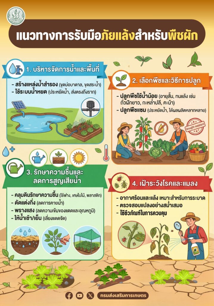 4. เฝ้าระวังโรคและแมลงอย่างเข้มงวด: หลังแล้งมักตามมาด้วยโรคและแมลงระบาด ต้องหมั่นตรวจแปลง และใช้ชีวภัณฑ์ในการควบคุมเพื่อความปลอดภัย