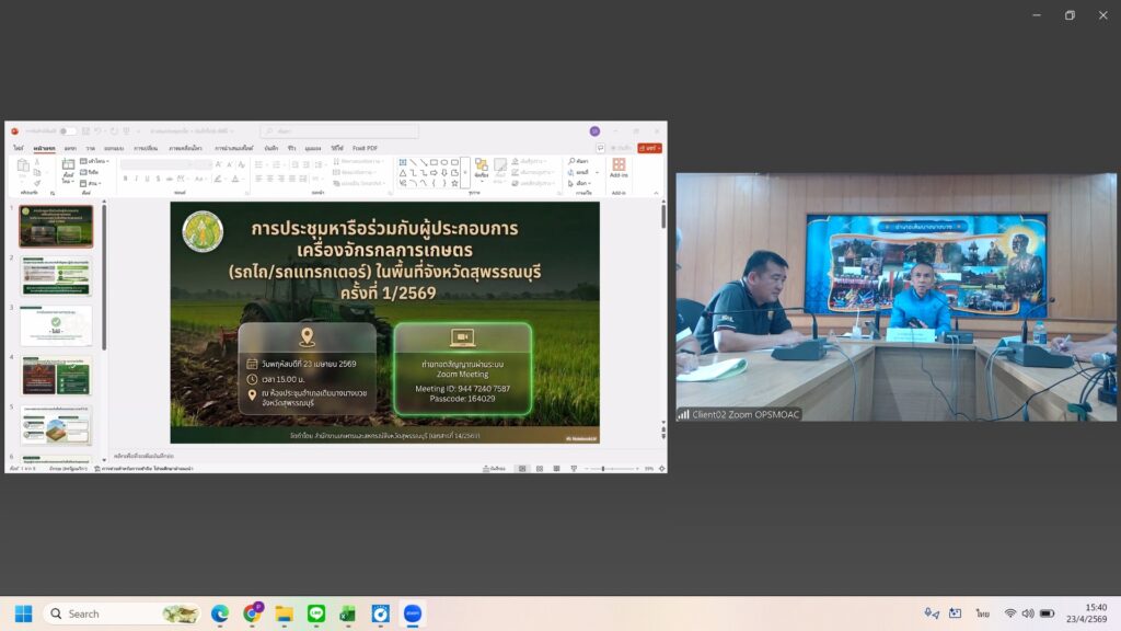 วันพฤหัสบดีที่ 23 เมษายน 2569 นางอรอนงค์ สว่างศรี เกษตรอำเภอเมืองสุพรรณบุรี พร้อมด้วยเจ้าหน้าที่สำนักงานเกษตรอำเภอเมืองสุพรรณบุรี และผู้ประกอบการเครื่องจักรกลการเกษตร (รถไถ/รถแทรกเตอร์) ในพื้นที่อำเภอเมืองสุพรรณบุรี ร่วมประชุมหารือร่วมกับผู้ประกอบการเครื่องจักรกลการเกษตร (รถไถ/รถแทรกเตอร์) ในพื้นที่จังหวัดสุพรรณบุรี ครั้งที่ 1/2569 ณ สำนักงานเกษตรอำเภอเมืองสุพรรณบุรี อำเภอเมืองสุพรรณบุรี จังหวัดสุพรรณบุรี