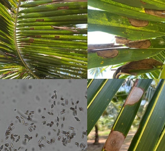 เตือนการระบาดศัตรูพืชระวัง โรคใบจุดสีเทา(เชื้อรา Pestalotiopsis palmarum) ในมะพร้าว ระวัง โรคใบจุดสีเทา(