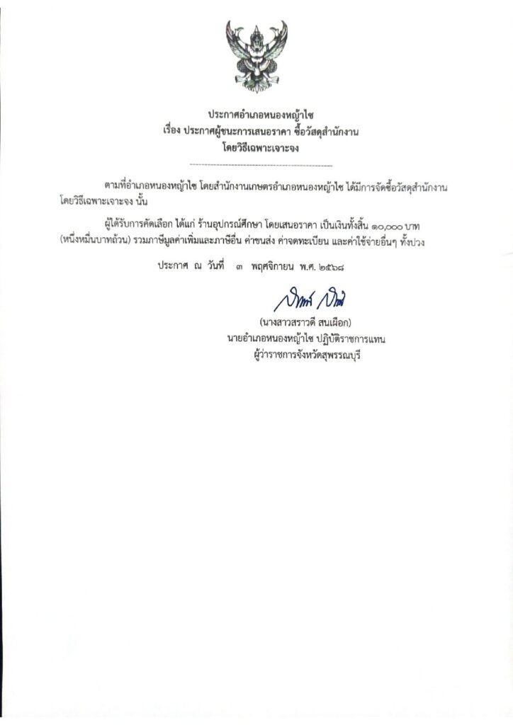 ประกาศอำเภอหนองหญ้าไซ เรื่อง ประกาศผู้ชนะการเสนอราคา ซื้อวัสดุสำนักงานโดยวิธีเฉพาะเจาะจงBy nongyasai / 3 พฤศจิกายน 2025