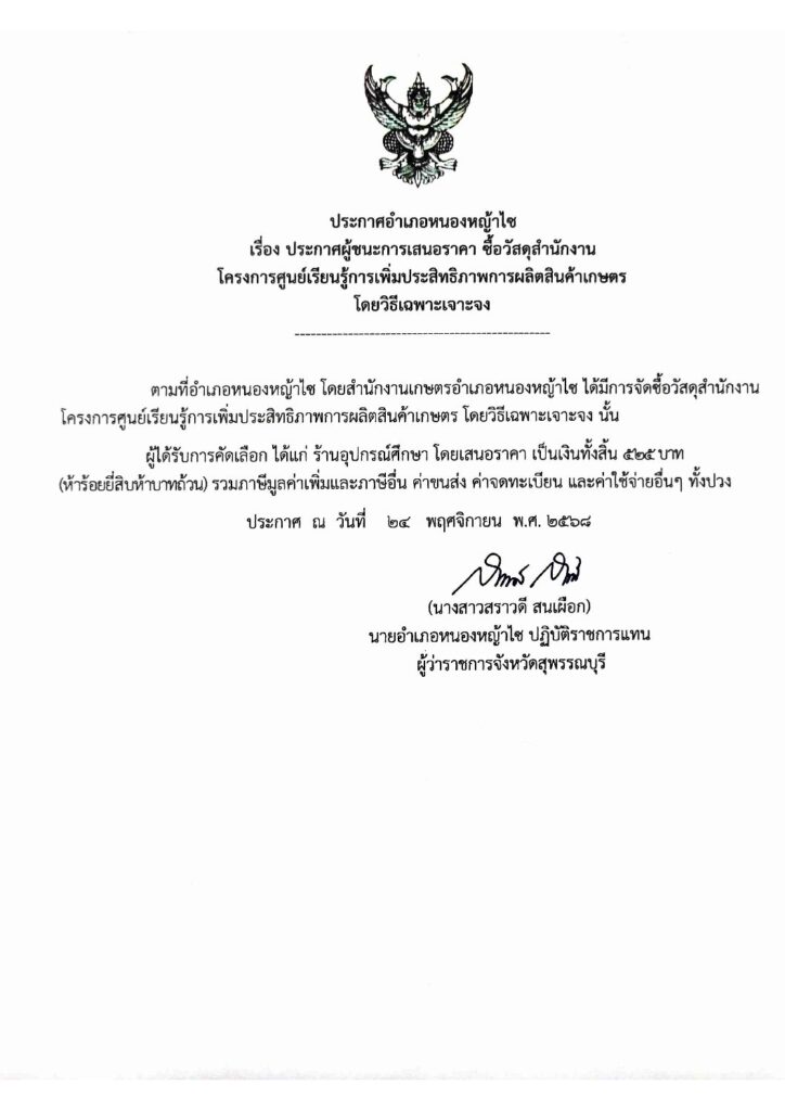 ประกาศผู้ชนะการเสนอราคา ซื้อวัสดุสำนักงานโครงการศูนย์เรียนรู้การเพิ่มประสิทธิภาพการผลิตสินค้าเกษตรBy nongyasai / 24 พฤศจิกายน 2025