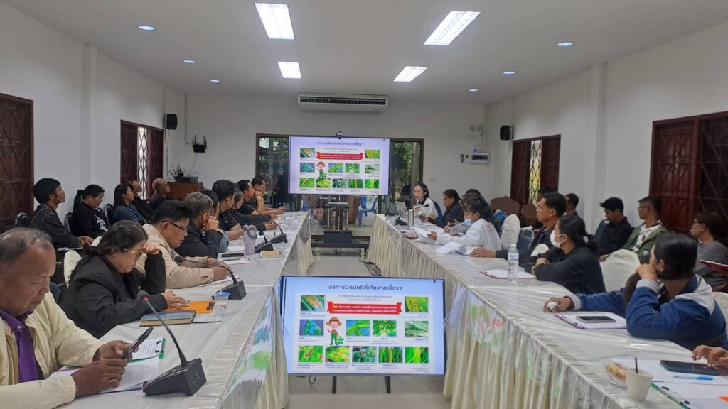 นางสาวเยาวลักษณ์ หว่างเขา นักวิชาการส่งเสริมการเกษตร รับผิดชอบงานอารักขาพืช ระดับอำเภอ สำนักงานเกษตรอำเภอหนองหญ้าไซ พร้อมด้วยเกษตรกรผู้สำรวจแปลงติดตามสถานการณ์ศัตรูพืช เข้าร่วมอบรมถ่ายทอดความรู้ ดังนี้