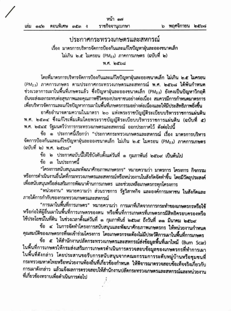 ประกาศกระทรวงเกษตรและสหกรณ์ เรื่อง มาตรการบริหารจัดการป้องกันและแก้ไขปัญหาฝุ่นละอองขนาดเล็กไม่เกิน 2.5 ไมครอน(PM 2.5) ภาคการเกษตร (ฉบับที่ 2) พ.ศ 2568By nongyasai / 18 ธันวาคม 2025 #ส่งเสริมสร้างสรรค์เกษตรสุพรรณบุรี