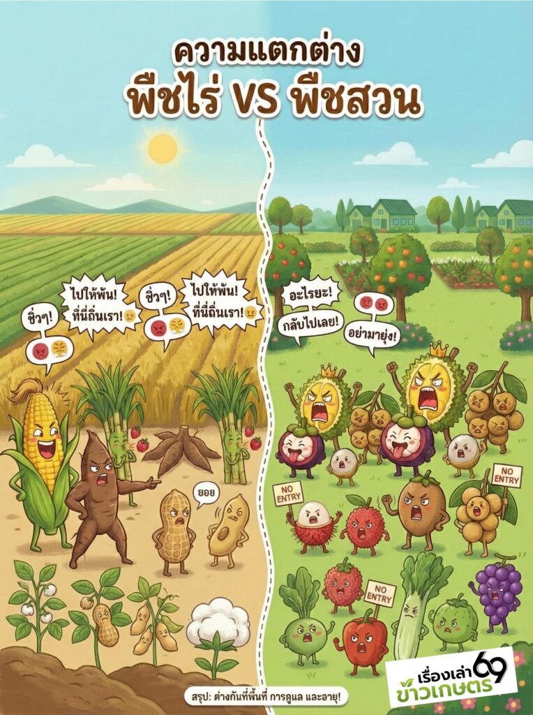 สรุปกันแบบสั้นๆ พืชไร่ปลูกพื้นที่กว้าง ดูแลง่าย เน้นปริมาณผลผลิตต่อรอบ (ข้าวโพด, มันสำปะหลัง) ส่วนพืชสวนปลูกพื้นที่จำกัด ดูแลประณีต ให้ผลผลิตต่อเนื่องหลายปี (ผลไม้, ผัก, ไม้ดอก) พืชไร่ส่วนใหญ่เก็บเกี่ยวแล้วตายไป (พืชล้มลุก) แต่พืชสวนดูแลต้นเดิมให้ผลผลิตซ้ำได้ #ข้อมูลจาก เรื่องเล่า ข่าวเกษตร