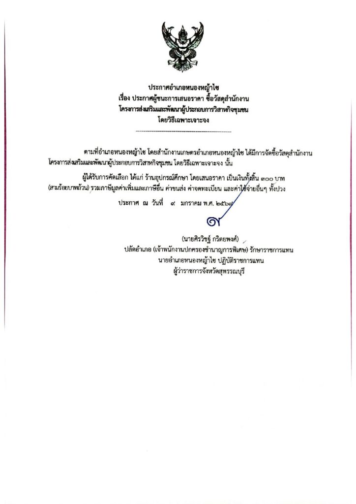 ประกาศผู้ชนะการเสนอราคา ซื้อวัสดุสำนักงาน โครงการส่งเสริมและพัฒนาผู้ประกอบการวิสาหกิจชุมชนBy nongyasai / 9 มกราคม 2026