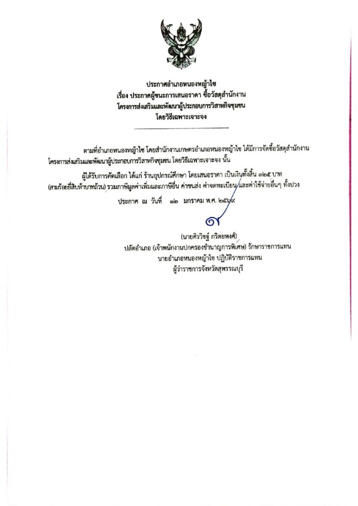 ประกาศผู้ชนะการเสนอราคา ซื้อวัสดุสำนักงาน โครงการส่งเสริมและพัฒนาผู้ประกอบการวิสาหกิจชุมชนBy nongyasai / 12 มกราคม 2026