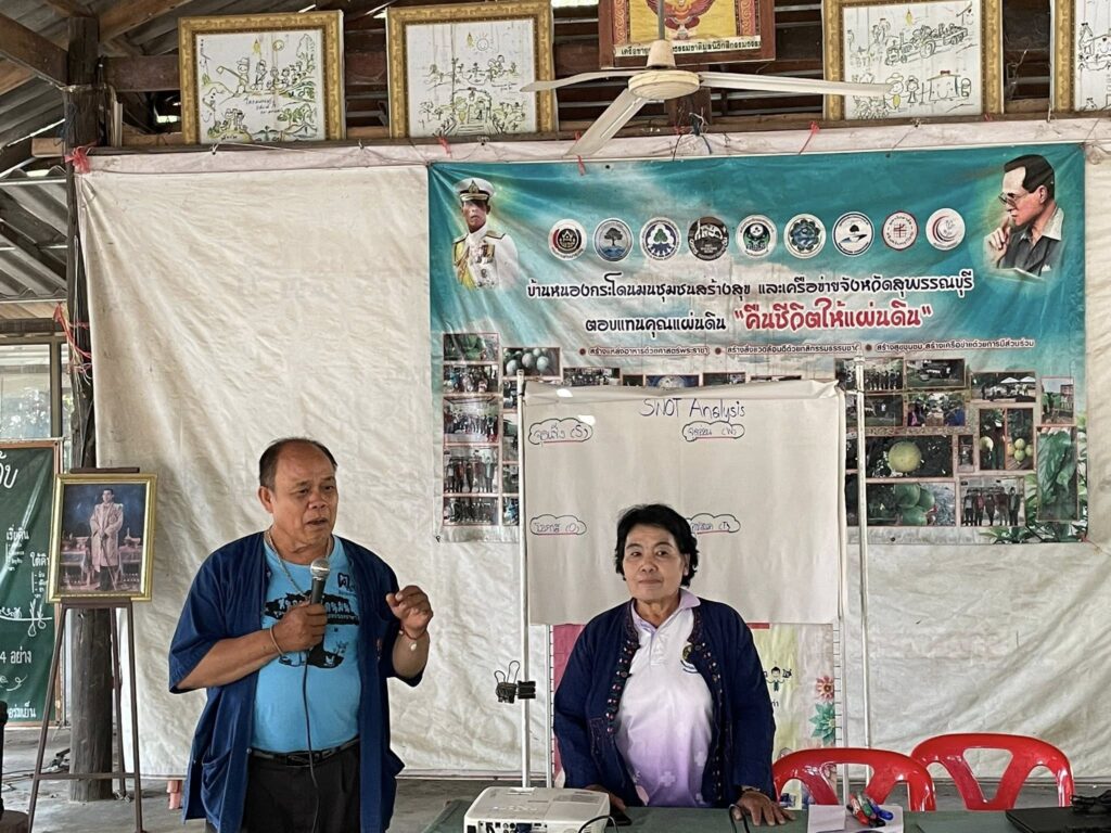 ณ วิสาหกิจชุมชน เกษตรอินทรีย์วิถีชุมชนบ้านหนองกระโดนมน หมู่ที่ 11 ตำบลหนองโพธิ์ อำเภอหนองหญ้าไซ จังหวัดสุพรรณบุรี