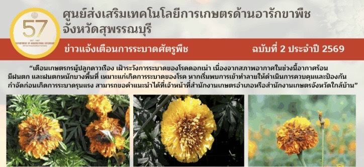 เตือนการระบาดศัตรูพืชศูนย์ส่งเสริมเทคโนโลยีการเกษตรด้านอารักชาพืช แจ้งเตือนการระบาดศัตรูพืช ฉบับที่ 2 ประจำปี 2569 “โรคดอกเน่าในดาวเรือง”