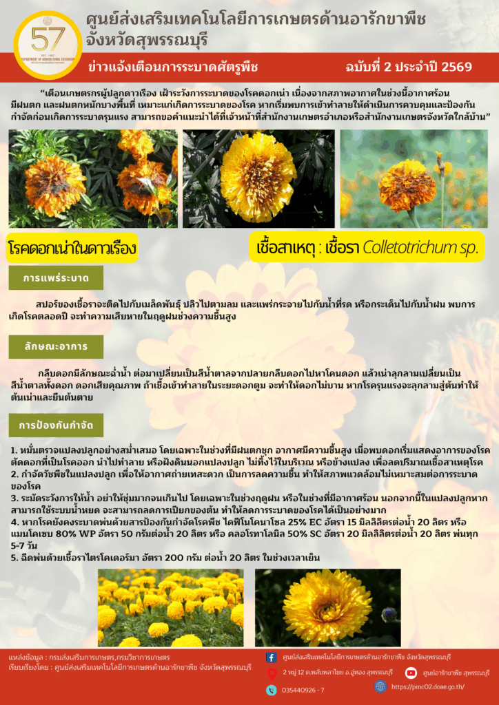 ศูนย์ส่งเสริมเทคโนโลยีการเกษตรด้านอารักชาพืช แจ้งเตือนการระบาดศัตรูพืช ฉบับที่ 2 ประจำปี 2569 “โรคดอกเน่าในดาวเรือง”By siprachan / 20 พฤศจิกายน 2025