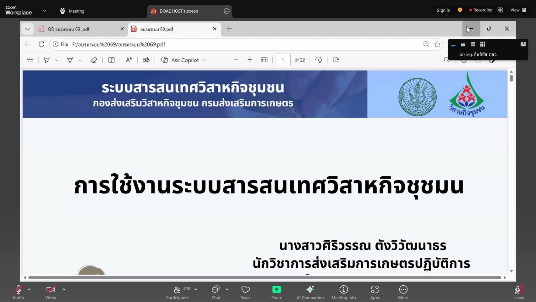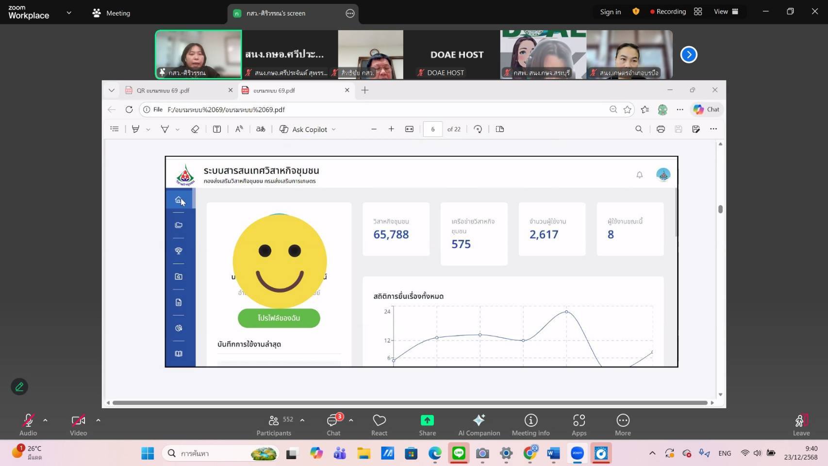 นางอรุณี อนันต์เวชานุวัฒน์ เกษตรอำเภอศรีประจันต์ พร้อมด้วยนางสาวภรณ์ชนก ทิพภักดี นักวิชาการส่งเสริมการเกษตรชำนาญการ ผู้รับผิดชอบงานวิสาหกิจชุมชนระดับอำเภอ เข้าร่วมอบรมการใช้งานระบบสารสนเทศวิสาหกิจชุมชน และชี้แจงแนวทางในการดำเนินการต่อทะเบียน ประจำปี 2569 ผ่านระบบออนไลน์ (Zoom meeting) โดยมีผู้เข้าร่วมการอบรม ประกอบด้วย เกษตรอำเภอ เจ้าหน้าที่ผู้รับผิดชอบงานวิสาหกิจระดับอำเภอ และระดับจังหวัด เข้าร่วมการอบรมดังกล่าว