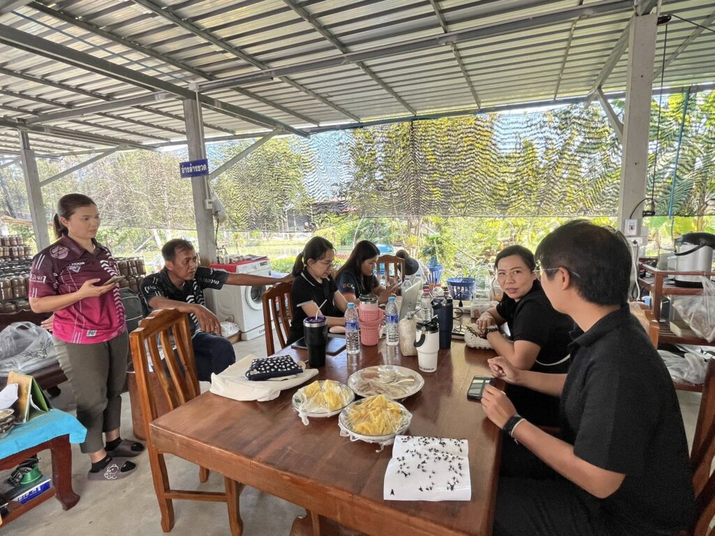 นางสาวเยาวลักษณ์ นาเอก นักวิชาการส่งเสริมการเกษตรชำนาญการ และเจ้าหน้าที่จากสำนักงานเกษตรจังหวัดสุพรรณบุรี เยี่ยมเยียน และติดตามการดำเนินงาน พร้อมทั้งเก็บข้อมูลการผลิตก้อนเชื้อเห็ดฟางและเห็ดนางฟ้าภูฐานเพิ่มเติมของนายนรินทร์ มณีวงษ์ Smart Farmer ตำบลศรีประจันต์ และเป็นประธานศพก.เครือข่ายกลุ่มส่งเสริมผลิตเชื้อเห็ดนางฟ้าภูฐาน ซึ่งดำเนินกิจกรรมผลิตก้อนเชื้อเห็ดนางฟ้าภูฐานและเห็ดฟาง โดยจำหน่ายทั้งก้อนเชื้อเห็ดและดอกเห็ด อีกทั้งยังเปิดให้เกษตรกรและผู้ที่สนใจเรื่องเห็ดสามารถเข้ามาศึกษากระบวนการเพาะเห็ดและการผลิตเชื้อเห็ดได้