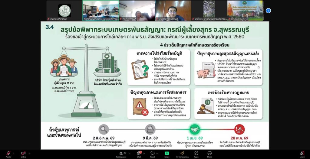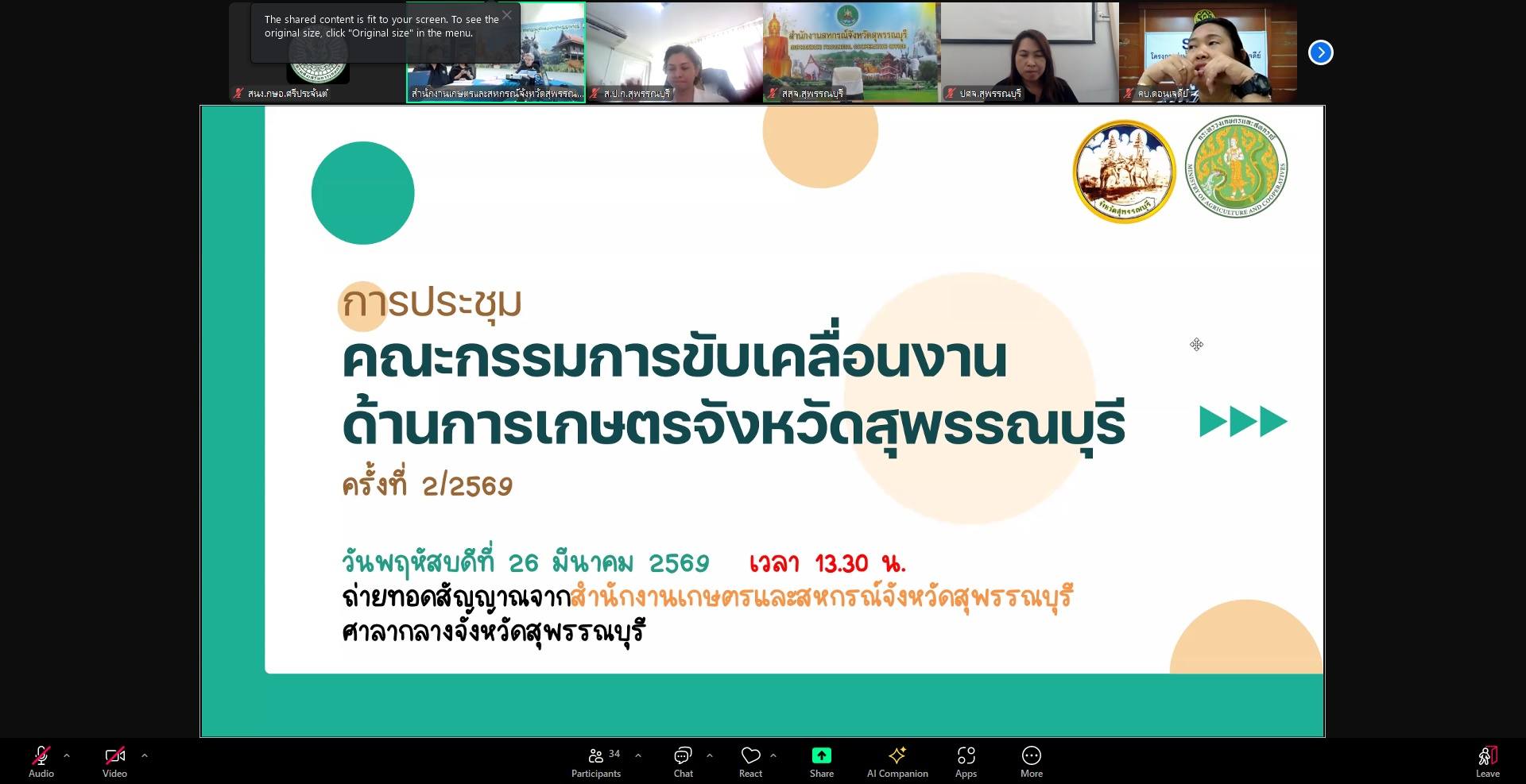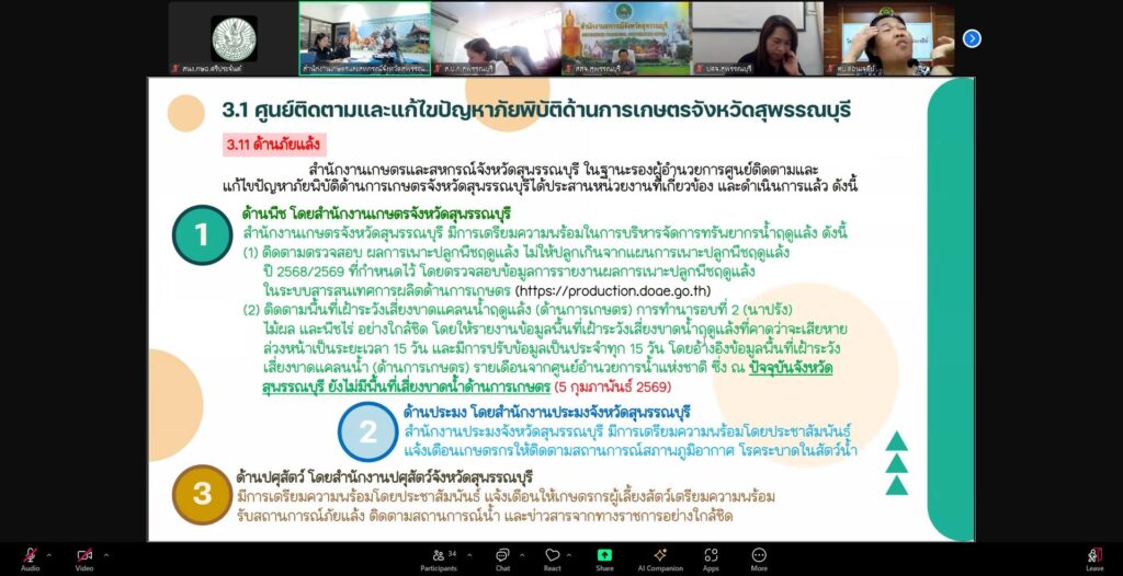📊นางสาวกรรณิกา เสือแดง นักวิชาการส่งเสริมการเกษตรชำนาญการ สำนักงานเกษตรอำเภอศรีประจันต์ ร่วมประชุมคณะกรรมการขับเคลื่อนงานด้านการเกษตรจังหวัดสุพรรณบุรี ครั้งที่ 2/2569 เพื่อรายงานผลการดำเนินงานและปัญหาอุปสรรค และมีวาระเพื่อพิจารณา เรื่องการดำเนินงานโครงการระบบส่งเสริมการเกษตรแบบแปลงใหญ่เพื่อปรับเพิ่มผลิตภาพการผลิตที่ไม่ได้รับการสนับสนุนงบประมาณแล้ว (การจัดชั้นคุณภาพแปลงใหญ่ฯ ปี 2559-2566) โดยประชุมผ่านระบบออนไลน์ Applcation Zoom