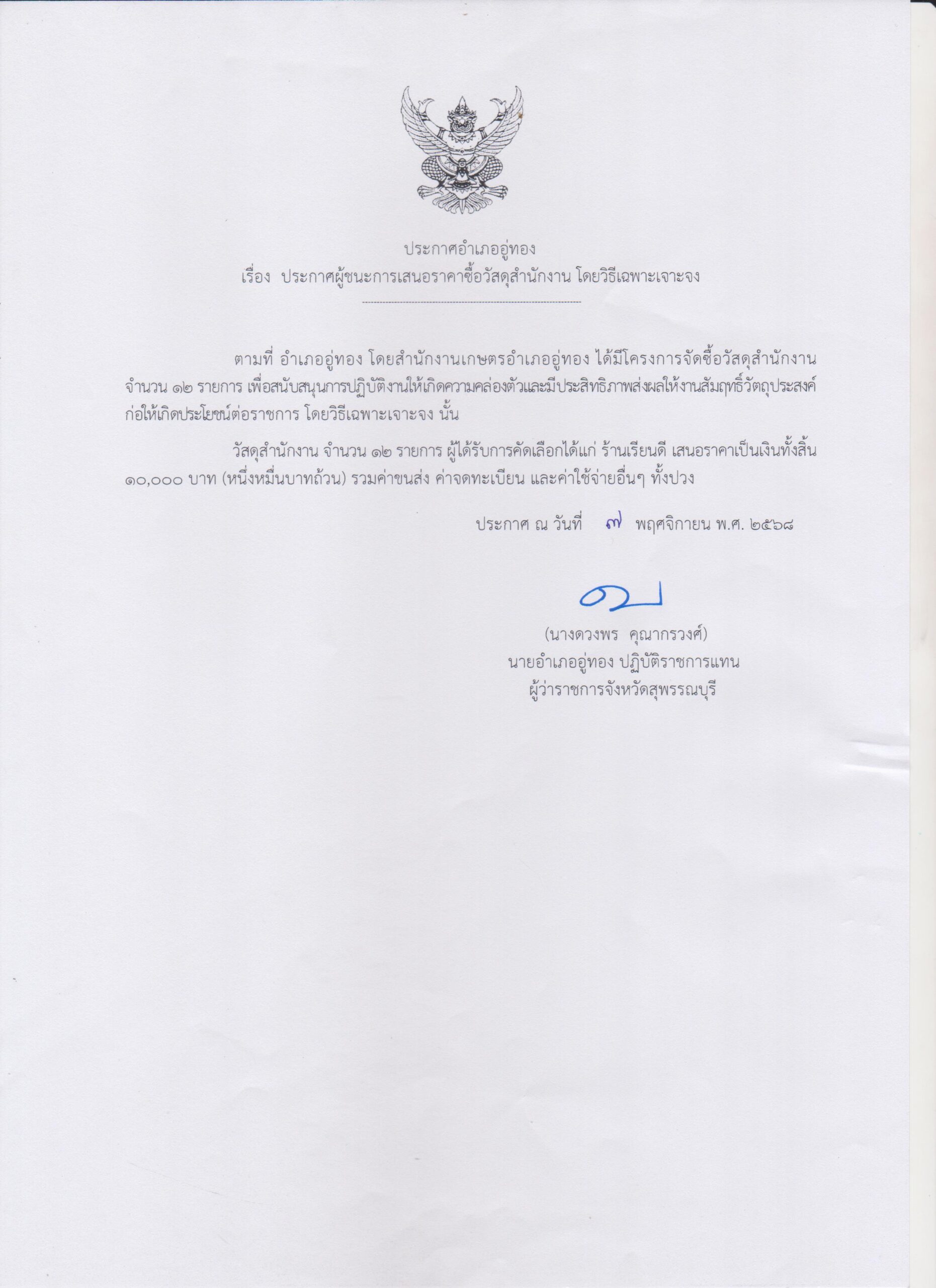 ประกาศผู้ชนะการเสนอราคาจ้างเหมาก่อสร้างรั้วพร้อมป้ายสำนักงานเกษตรอำเภออู่ทอง