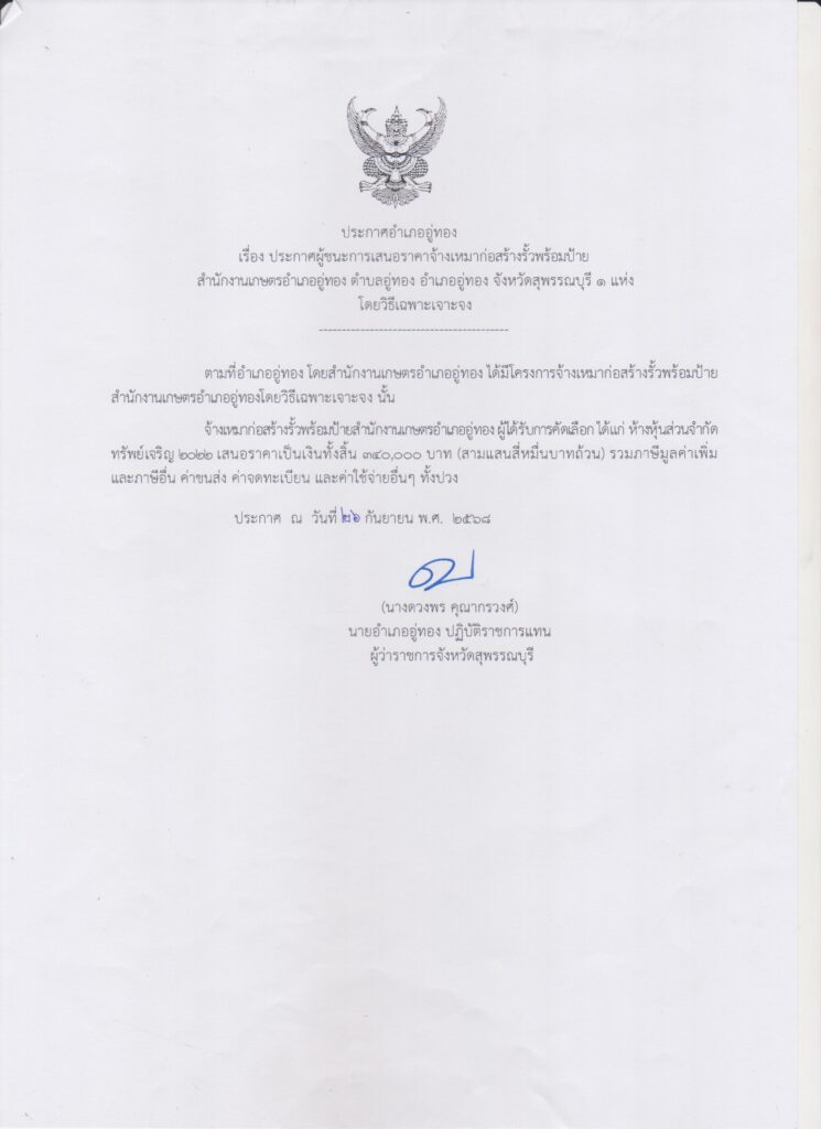 ประกาศผู้ชนะการเสนอราคาจ้างเหมาก่อสร้างรั้วพร้อมป้ายสำนักงานเกษตรอำเภออู่ทองBy uthong / 26 กันยายน 2025