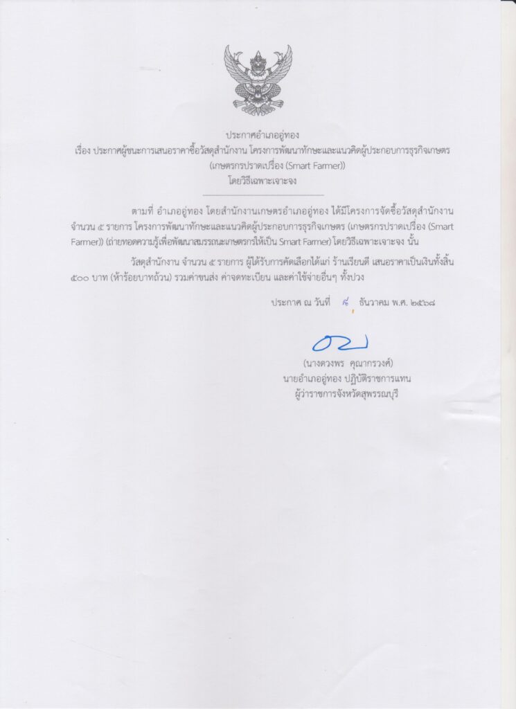 ประกาศผู้ชนะการเสนอราคาซื้อวัสดุสำนักงาน โครงการพัฒนาทักษะและแนวคิดผู้ประกอบธุรกิจเกษตร (เกษตรกรปราดเปรื่อง (Smart Farmer))By uthong / 8 ธันวาคม 2025
