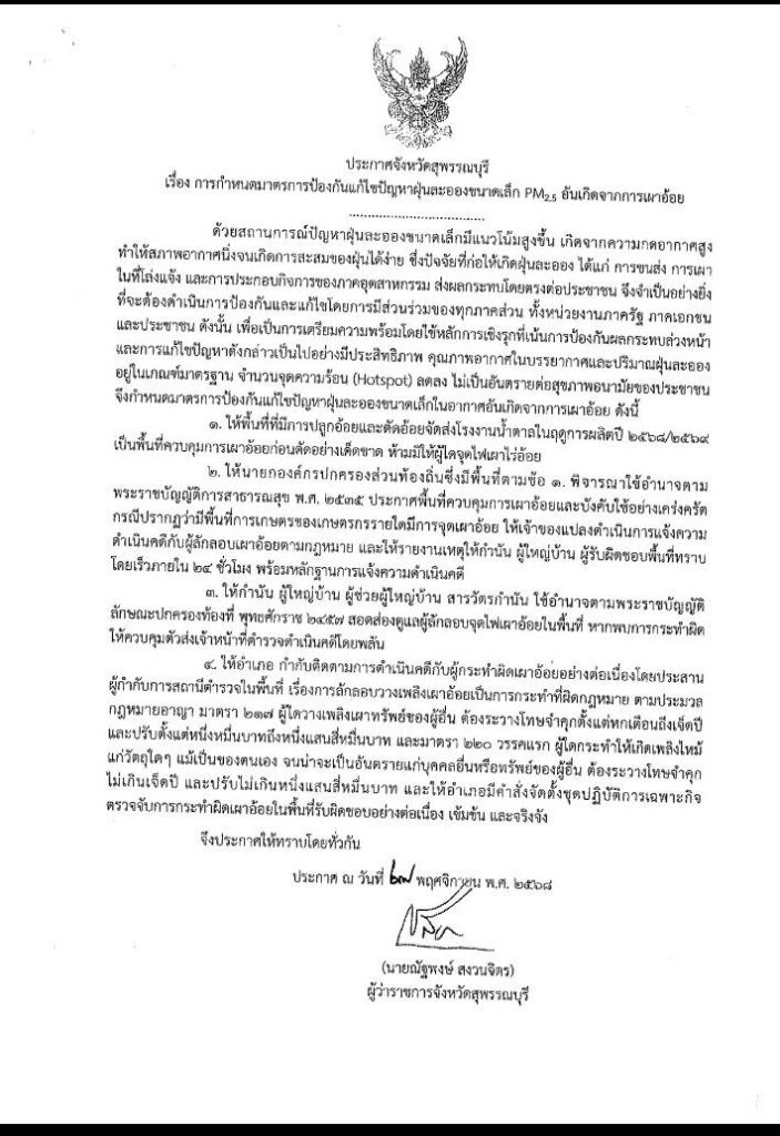 ประกาศจังหวัดสุพรรณบุรี เรื่อง การกำหนดมาตรการป้องกันแก้ไขปัญหาฝุ่นละอองขนาดเล็ก 2.5 อันเกิดจากการเผาอ้อยBy uthong / 16 ธันวาคม 2025