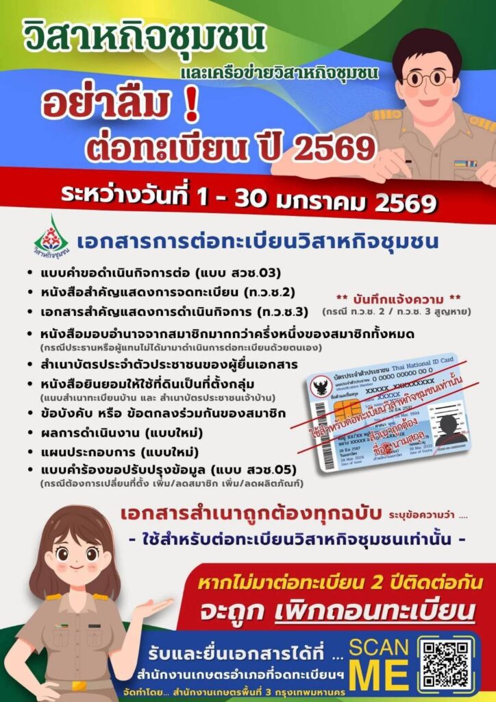 ประชาสัมพันธ์การต่อทะเบียนวิสาหกิจชุมชน ปี 2569 ระหว่างวันที่ 1-30 มกราคม 2569By uthong / 23 ธันวาคม 2025