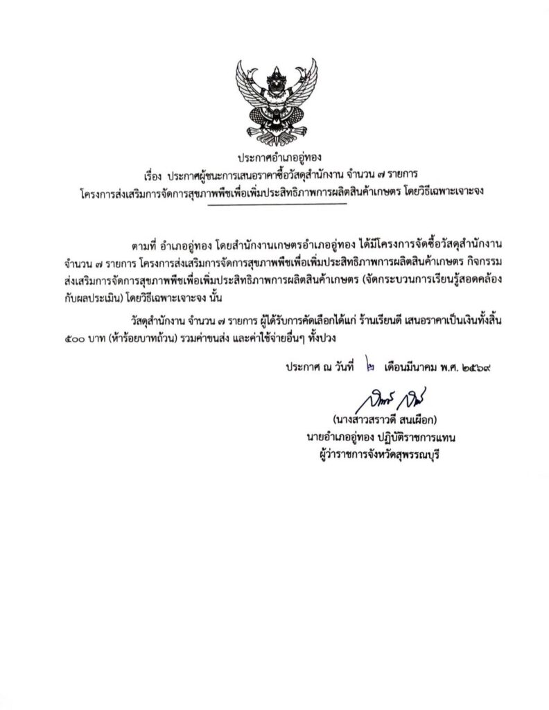 ประกาศผู้ชนะการเสนอราคาซื้อวัสดุสำนักงานจำนวน 7 รายการ โครงการส่งเสริมการจัดการสุขภาพพืชเพื่อเพิ่มประสิทธิภาพการผลิตสินค้าเกษตร โดยวิธีเฉพาะเจาะจงBy uthong / 2 มีนาคม 2026